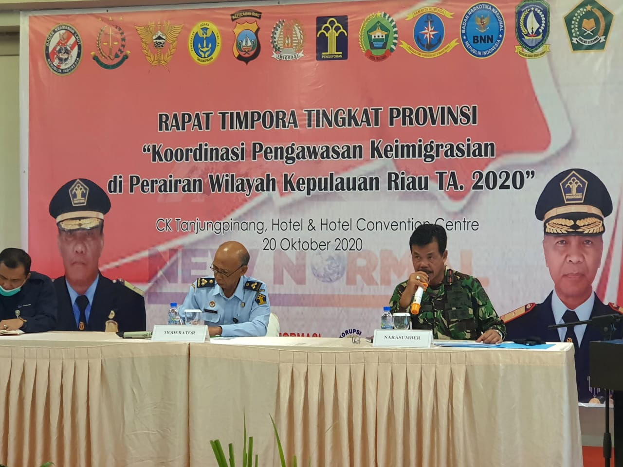 TANJUNGPINANG – Komandan Pangkalan Utama TNI Angkatan Laut (Danlantamal) IV Tanjugpinang Laksamana Pertama TNI Indarto Budiarto, S.E., M.Han., bersama Asintel Danlantamal IV Kolonel Laut (P) Tommy Herlambang,S.E., hadiri undangan sebagai Narasumber pada acara Rapat Tim Pengawasan Orang Asing Provinsi Kepulauan Riau Tahun 2020 yang berlangsung di Convention Centre Hotel CK Tanjungpinang Jl.Raja Haji Fisabilillah Tanjungpinang Kepulauan Riau, Selasa pagi 20 Oktober 2020.