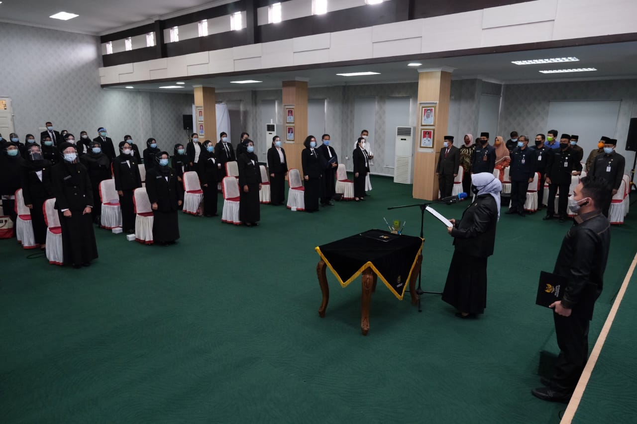 “Tidak berbeda dengan pelantikan pelantikan sebelumnya, pelantikan hari ini merupakan pengambilan sumpah PNS sebanyak 4 orang yang diangkat melalui formasi bidan dari Kementerian Kesehatan pada tahun 2019 dan 1 orang dari pengangkatan IPDN serta pelantikan PNS yang diangkat dalam jabatan fungsional sebanyak 65 orang,” ujar Rahma.