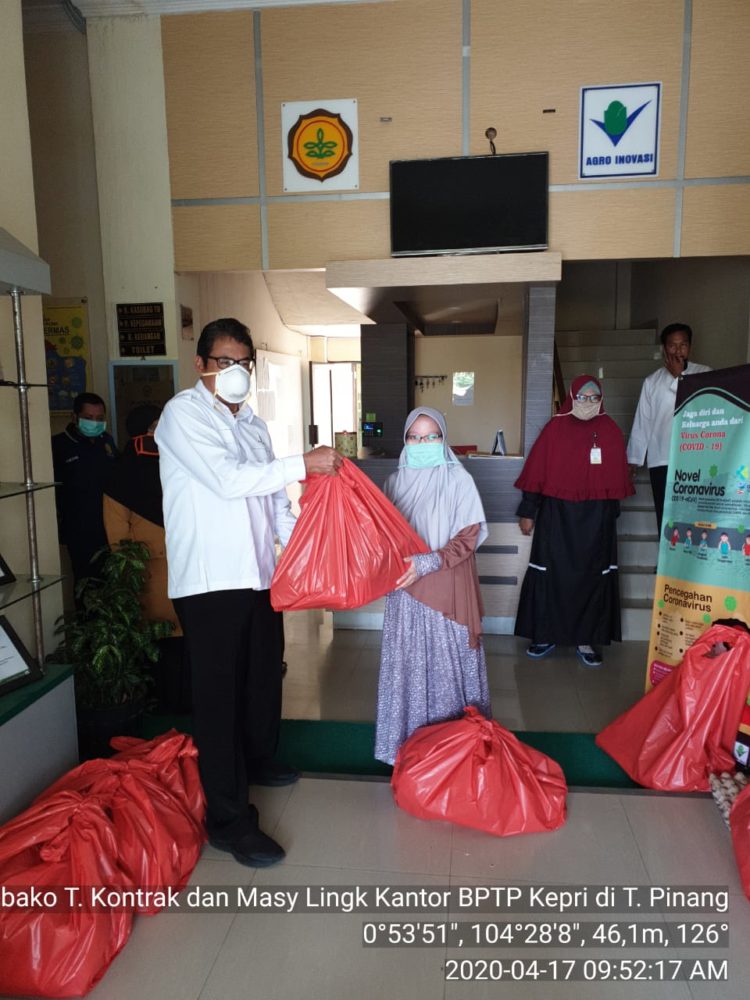 KEPRI- Kepala BPTP Kepri Dr. Ir. Sugeng Widodo, MP, secara simbolis menyerahkan bantuan sembako pencegahan dampak COVID-19 kepada pihak masyarakat...