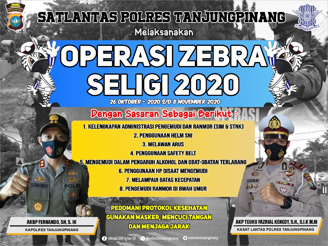 “Operasi Zebra Seligi 2020 saat pandemi ini, memiliki metode dan pendekatan berbeda karena polisi akan lebih mengutamakan edukasi dan imbauan ke masyarakat,” terang Kasat Lantas Polres Tanjungpinang.